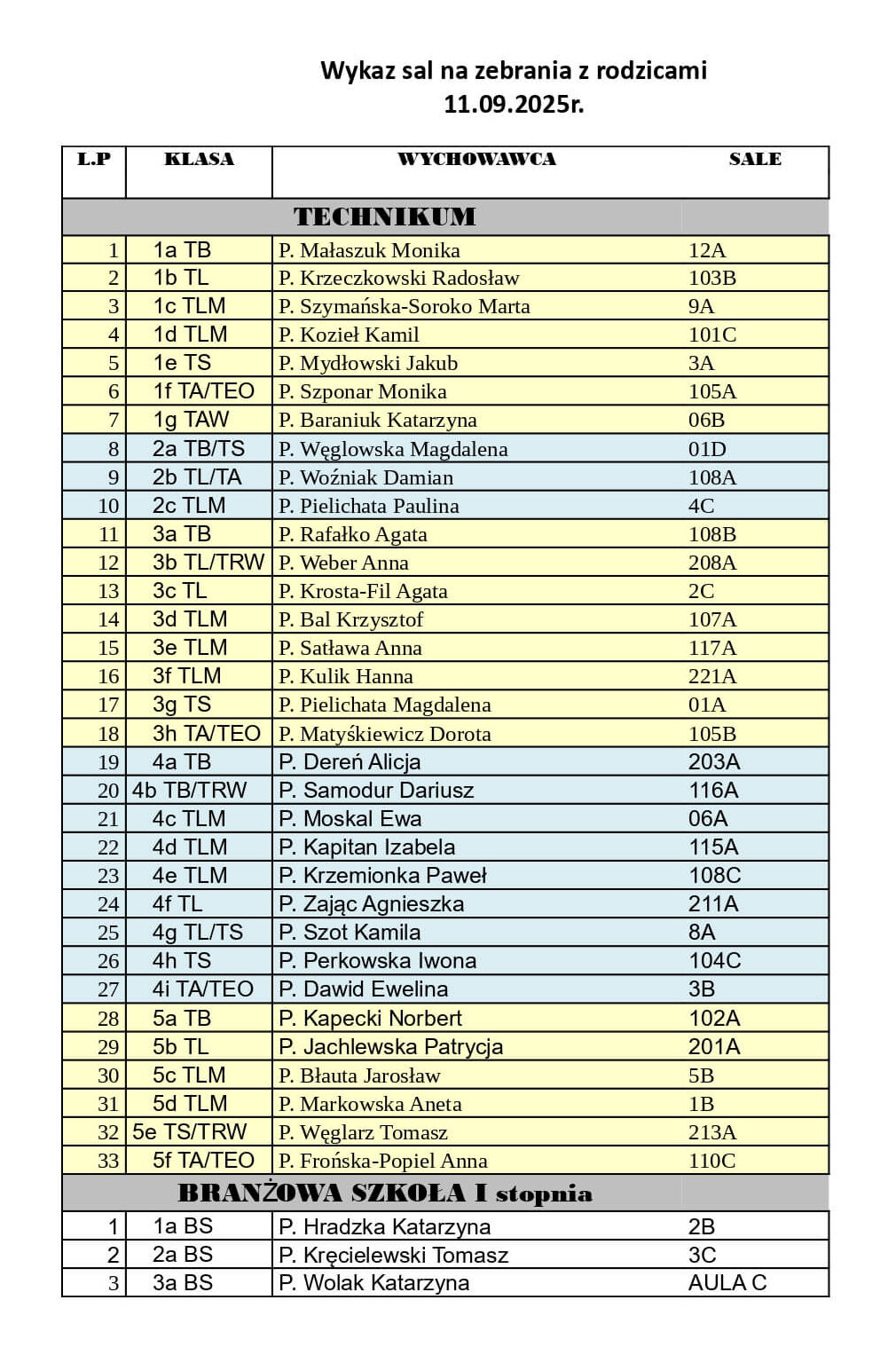 WYKAZ SAL NA ZEBRANIA Z RODZICAMI |