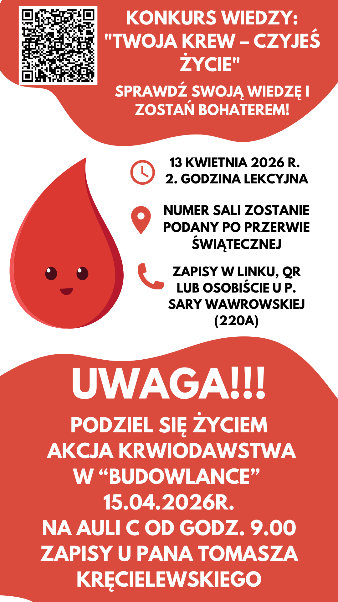 🩸 Twoja krew – czyjeś życie! Wielki tydzień krwiodawstwa w Budowlance! 🩸Hej, Budowlanka! Przed nami wyjątkowy tydzień, w którym możemy udowodnić, że mamy wielkie serca. Mamy dla Was dwa ważne wydarzenia: