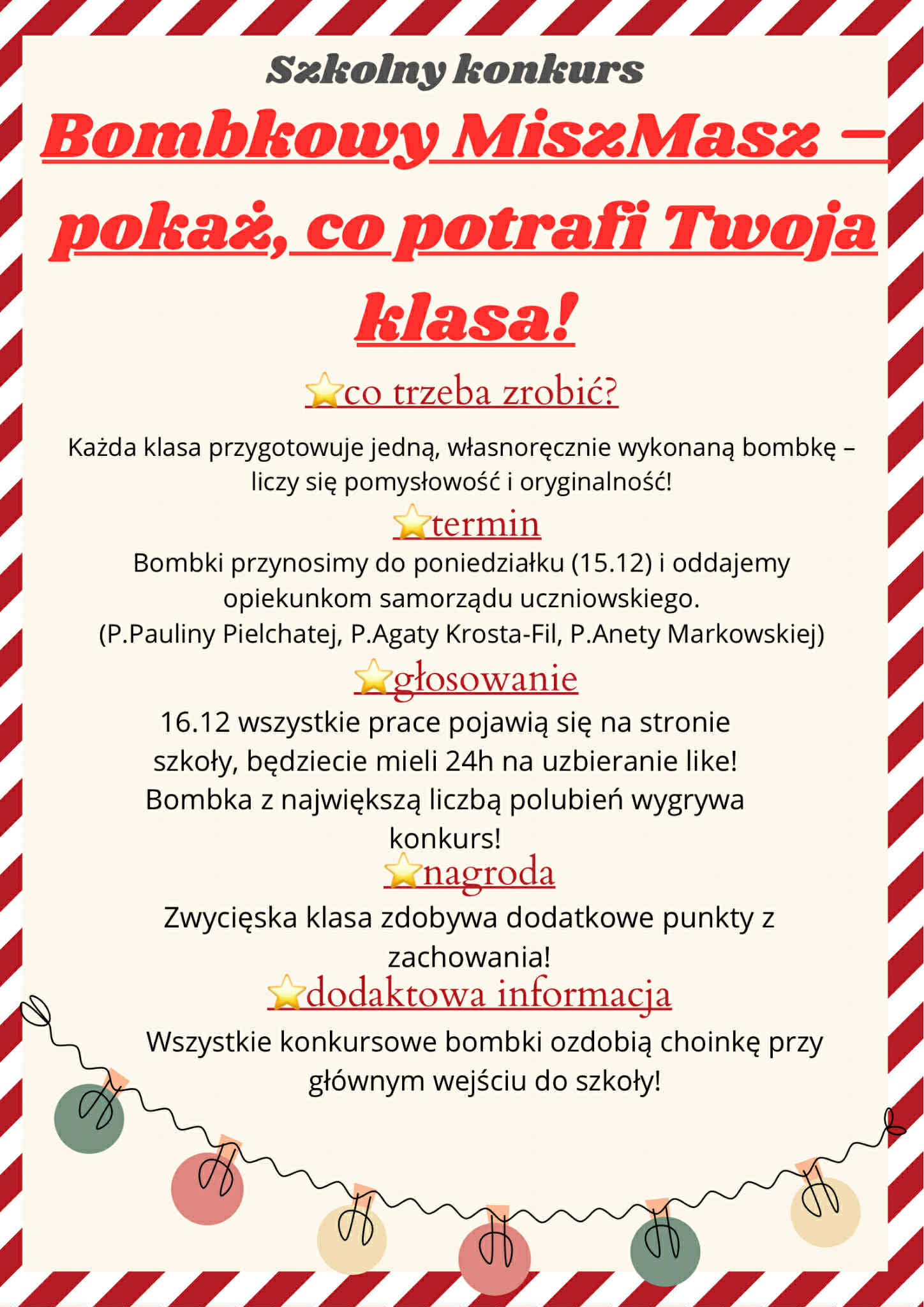 Załóżcie więc kreatywne czapki, odpalcie wyobraźnię na tryb „świąteczne turbo” i pokażcie całej szkole, że Wasza klasa to mistrzowie od bomb(k)owych arcydzieł!